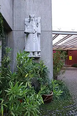 Die monumentale Kirche in der Form eines Kreuzes mit Flachdach hat die inneren Ecken gerundet und etwas eingezogen, womit sich die Kreuzarme nach außen etwas ausweiten. Die Wandflächen wurde in roter Sichtziegelbauweise und mit Sichtbetonbändern an Kanten und Querteilungen ausgeführt. Im Erdgeschoß bilden Nebenräume, wie die Taufkapelle und die Wochentagskapelle, den Grundriss eines Achteckes.