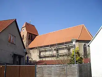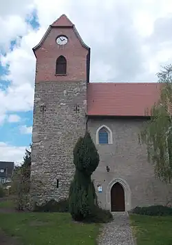 Die Kirche ist ein romanisches Bauwerk des späten 12. Jahrhunderts mit Westturm und im Süden damit fluchtendem, im Norden dagegen vorspringendem Schiff. Der dreiseitige Ostschluss mit Piscina-Ausguss an der Südseite stammt von einer spätgotischen Erweiterung, ebenso das spitzbogige Südportal mit Stabwerkrahmung wie auch die erneuerten Maßwerkfenster. Das Turmobergeschoss ist in Backstein ausgeführt und stammt von einer Instandsetzung in den Jahren 1933/34; in diesem Zusammenhang wurden vermutlich auch die Maßwerkfenster verändert. In der Nordwand des Schiffes sind stark verwitterte Reste eines romanischen, vermauerten Portals erhalten, die Hand im Kreisfeld des ehemaligen Tympanons (ähnlich dem in Burgsdorf) ist heute nicht mehr erkennbar.