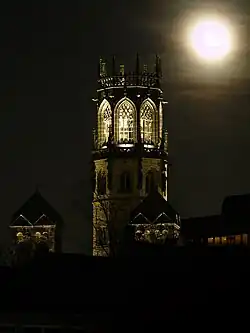 Nachdem die Kirche beim Stadtbrand im Jahre 1383 Schaden genommen hatte, wurde sie in veränderter Form wiederaufgebaut. Dabei wurde auch die Jocheinteilung der Seitenschiffe abgeändert.[3] Der zunächst relativ kleine Chor auf der Ostseite wurde zu einem großen Hochchor erweitert. Da hierbei das Dach zusätzlich erhöht wurde, musste der im Zentrum der Kirche liegenden Vierungsturm ebenfalls erhöht werden. Der ursprünglich mit zwei romanischen Geschossen mit gekuppelten Fensteröffnungen aufwartende Turm wurde um eine Etage im Stile der Gotik aufgestockt. Diese ist mit Blendquadern und spitzbogigen Maßwerkfenstern versehen. Zusätzlich bekam der Vierungsturm noch ein durchsichtiges Obergeschoss mit einer Maßwerkgalerie und krabbenbesetzten Fialen als Verzierung.