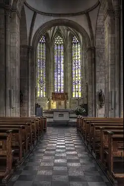 In den sieben Wänden des Chors befinden sich die Fenster von Vincenz Pieper. In der Gesamtbetrachtung vereinen sie sich zu einem Gesamtbild, in dem die Pfeiler zwischen den einzelnen Fenstern zu verschwinden scheinen. Im mittleren, direkt nach Osten gerichteten Fenster wird der Heilsweg Jesu Christi aufgezeigt, das heißt seine Geburt, sein Leiden und Sterben, seine Auferstehung und Himmelfahrt sowie seine Wiedergeburt. In den beiden sich direkt anschließenden Fenstern sind die Zeugen des Herrn zu sehen. Neben der Komposition der Fenster in der Apsis existieren weitere Fenster mit biblischen Themen. So zeigt das Fenster in der Nordwand des Querschiffs das Pfingstwunder und das in der Südwand die Schöpfung des Menschen. Im Fenster über dem Westportal wird das Jüngste Gericht thematisiert.