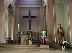 Der Altarraum ist eine schmalere, nur wenig erhöhte Fortsetzung des Mittelschiffs mit flachem Wandabschluss, den die Tabernakelstele und darüber ein großer, an frühromanische Vorbilder erinnernder Crucifixus beherrschen. Davor stehen Altar und Ambo aus moderner Zeit.
