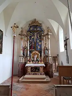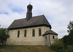 Die gotische Saalkirche wurde im 15. Jahrhundert erbaut und im 18. Jahrhundert barock umgestaltet. Sie besteht aus dem Langhaus, dem dreiseitig geschlossenen Chor im Osten in einem gemeinsamen Baukörper, der Sakristei an der Südostwand des Chors und einem Vorbau vor der Fassade im Westen. In der Mitte des Satteldachs erhebt sich ein achteckiger Dachreiter mit einer Zwiebelhaube.