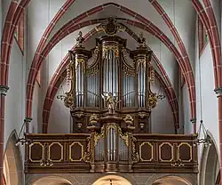Das Gehäuse der um 1730 gebauten Barockorgel wurde 1907 durch den Orgelbauer Klais umgerüstet und erhielt eine pneumatische Kegelladenorgel mit zwei Manualen und Pedal. Nach dem Zweiten Weltkrieg erfolgten zunächst einige Änderungen des Instruments durch die Firma Klais und im Jahr 1972 die Elektrifizierung der Orgel durch das niederländische Orgelbauunternehmen Verschueren. 1996 erneuerte sie Hans Gerd Klais im historischen Gehäuse unter Verwendung originaler Register. Sie besitzt drei Manuale und 34 Register. Das Instrument steht auf einer steinernen Empore von 1728, die auf drei Arkaden aus Trachyt ruht.
