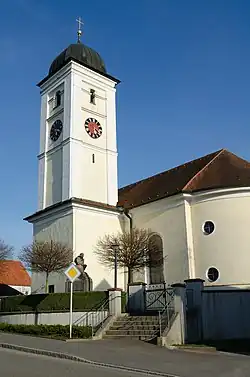 Die spätklassizistische Saalkirche wurde 1823 nach einem Entwurf von Johann Michael Voit erbaut. Sie besteht aus einem Langhaus, das 1932 nach Westen durch Michael Kurz verlängert wurde. Die eingezogenen, halbrunden Apsiden stehen an den Schmalseiten im Osten und Westen. An der Nordwand des Langhauses steht der Kirchturm auf quadratischem Grundriss, dessen untere Geschosse im Kern spätgotisch sind. Er wurde mit zwei Geschossen aufgestockt, das obere beherbergt die Turmuhr und den Glockenstuhl, und mit einer Glockenhaube bedeckt. Der Innenraum des Langhauses ist mit einer Decke mit Hohlkehle überspannt. Der Hochaltar wird von den Statuen des Dionysius von Paris und der Margareta von Antiochia flankiert.