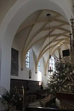 Der Innenraum des Langhauses ist mit einer Flachdecke überspannt, der des Chors mit einem Netzgewölbe.