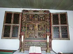 - Der Altar von 1592 ist im Stil der Renaissance gehalten. Der Schrein zeigt im Zentrum das Kruzifix, umgeben von der in sechs Reliefs dargestellten Lebensgeschichte Jesu. Die Flügel sind mit den Einsetzungsworten, wie sie bei der Abendmahlsfeier gesprochen werden, beschriftet. Die Namen der Stifter sind in der Predella und in den unteren Feldern des rechten Flügels festgehalten.