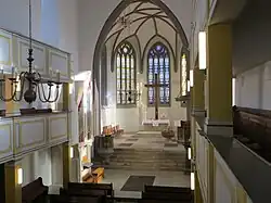 - Orgel auf der Westempore von 1796 (Umbauten 1954/55 und 1966); Chororgel („Johann-Walter-Positiv“) von 2021 vor den Stufen zum Chor
