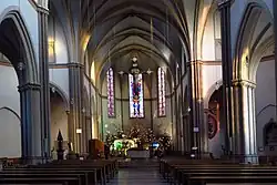 Firma Müller aus Reifferscheidt in der Eifel erbaute 1888 die erste Orgel. Nach der Gebäude-Erweiterung von 1909 wurde diese zu klein. Daher erhielt Orgelbau Klais den Auftrag zu einem Neubau, der 1912 als Opus 438 fertiggestellt wurde.[2] Mit 30 Registern handelt es sich hierbei um die größte erhaltene Klais-Orgel im Stadtgebiet von Mönchengladbach.[3] Gegen Ende des Zweiten Weltkrieges durch Querschläger und Granateinschläge beschädigt, wurde die Orgel 1947 von der Aachener Werkstatt Stahlhuth notdürftig wiederhergestellt und die Disposition in neobarockem Sinne umgestaltet. Im zweiten Manual wurden über die Hälfte der Stimmen verändert, indem Register aufgerückt wurden (z. B. Lieblich Gedackt 16' zu 8') oder gar Grundstimmen zu kleineren Registern und Aliquoten (z. B. Quinte 1 1⁄3′) abgeschnitten wurden. In Hauptwerk und Pedal wurde jeweils nur ein Register ausgetauscht (HW: Bleigedackt 4' statt Gamba 8', PD: Choralbaß 4' statt Violoncello 8').[4] Die pneumatischen Trakturen wurden belassen und nicht elektrifiziert. Da die Orgel gegen Ende des 20. Jahrhunderts zunehmend defekt und statisch instabil wurde,[5] plante die Gemeinde seit 2007 mit Orgelbau Klais eine gründliche Restaurierung und Wiederherstellung. Zu ihrem 100. Geburtstag im Jahr 2012 wurde die in den Originalzustand zurückgeführte Orgel in einem Festgottesdienst am 8. Dezember 2012 wieder in Betrieb genommen.[6] Zum besonderen, gleichsam kathedralesken Hörerlebnis trägt bei, dass sich das Instrument auf einer sehr hoch gelegenen Empore befindet und von dort seinen Klang in einen Kirchenraum mit sieben Sekunden Nachhall entlässt. Die Disposition lautet seit der Restaurierung 2012:[7][8]