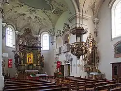 Der Innenraum ist in drei Joche geteilt. Das letzte Joch wird fast vollständig von der Orgelempore von 1690 ausgefüllt, auf der sich ein modernes zweigeteiltes Orgelprospekt befindet. Der üppige Stuck im Kirchenraum im italienischen Stil wurde von dem Tessiner Prospero Brenno entworfen und ausgeführt. Insgesamt 150 Engel findet man an der Recke in den Kapitellen am Blick in den Himmel und am Hochaltar. Zudem findet man überall mediterrane Gemüse- und Obstsorten.