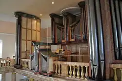 Das Hauptwerk befindet sich im Zentrum der Emporenbrüstung (sichtbar Prinzipal 8′). Seitlich davon sind die Pedaltürme erkennbar (sichtbar Prinzipal 16′). Über dem Spieltisch mit drei Manualen und Pedal (50 Register) befindet sich in einem Gehäuse das Schwellwerk.