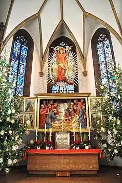 Über dem Tabernakel befindet sich der Flügelaltar, welcher in der Mitte als Hauptmotiv die Entschlafung Mariens im Kreise der Jünger Jesu zeigt. Die beiden Seitenflügel weisen je vier Bildmotive aus dem Leben Mariens auf. Sie beginnen mit einer Darstellung der Verkündigung Mariens und enden mit der Hochzeit zu Kana.[10] Die Rückseiten der Flügel stellen die Nebenpatrone der Pfarrkirche (St. Laurentius, St. Sebastian) dar. In der Fastenzeit sowie in der Adventszeit wird der Flügelaltar zugeklappt, sodass auch diese Gemälde besichtigt werden können.