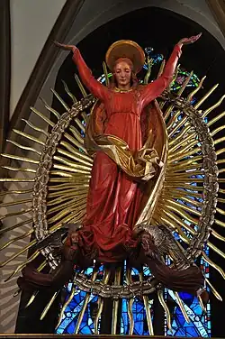 Unmittelbar über dem Flügelaltar fügt sich thematisch eine Darstellung der Aufnahme Mariens in den Himmel in Form einer Strahlenmandorla an, was zugleich auch das Patrozinium der Pfarrkirche in bildlicher Weise zur Schau stellt.