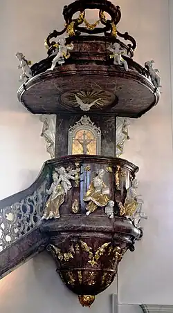 „beachtenswerte Spätbarockschöpfung, Korpus rund, mit Volutenpilastern und blumengeziertem Untersatz. Zwischen den Pilastern vollrund gearbeitete Sitzfiguren der vier Evangelisten. Der ebenfalls runde Schalldeckel hat eine hohe, durchbrochene Volutenöffnung, darauf Engelfigürchen. Die Brüstung des geschwungenen Kanzelaufganges zeigt reiche, durchbrochene Rokokomuschelschnitzerei. An der Rückwand der Kanzel ein gutes Holzkruzifix, gerahmt mit Laub- und Bandwerkschnitzerei mit einem Pelikan oben, aus der zeit um 1725.“
