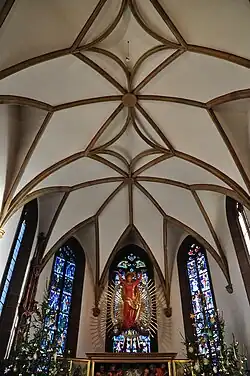 Den Chor kennzeichnet ein dreijochiges Netzgewölbe, das sich in Achteckseiten erstreckt.