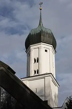 Die Kirche besteht aus einem modernen, von Karl Sendlinger entworfenen Langhaus, das 1978/79 an den Kirchturm auf quadratischem Grundriss und den dreiseitig geschlossenen Chor des gotischen Vorgängerbaus angebaut wurde. Der Innenraum des Chors, der jetzt als Kapelle dient, ist mit einem Stichkappengewölbe überspannt. Der Kirchturm wurde mit einem achteckigen Geschoss aufgestockt, das mit Pilastern an den Ecken versehen ist, und mit einer Zwiebelhaube bedeckt. Zur Kirchenausstattung gehören neobarocke Altäre und ein Kruzifix von 1630, das Christoph Rodt zugeschrieben wird. Die Orgel mit elf Registern, verteilt auf zwei Manuale und Pedal wurde 1981 von der Orgelbau Sandtner als Opus 92 errichtet.[1]