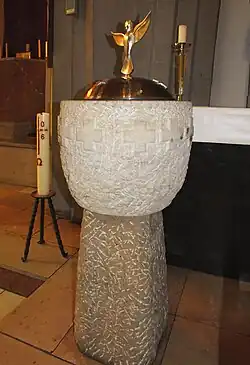 Der Taufstein mit figürlicher Keramik (Maria mit Kind) sowie die Apostel an den Längswänden des Kirchenhauptraumes wurden in den Hami-Werkstätten hergestellt. Die Maria-Figur erhielt später ihren Platz anstelle des früheren Taufbrunnens außen an der Turmeingangsfront, der Stein selbst wurde aufgegeben. Als der Kirchgänger und Steinmetz Carlo Wloch feststellte, dass in der Kirche nun ein Taufstein fehlte, fertigte er einen neuen an und spendete diesen seiner Gemeinde.