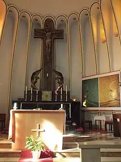 Über dem Hauptaltar, der auf Anregung des Kuratus Lenzel auf Basis einer visionären Schau des Hl. Johannes in der Apokalypse einer alttestamentlichen Bundeslade nachgestaltet wurde, hängt ein großes Altarkreuz: auf einem stabilen Holzgerüst befindet sich ein Kruzifixus aus Terrakotta, das in der Porzellanmanufaktur Meißen gebrannt worden ist. Während des Transports nach Berlin brach jedoch der Körper infolge einer Autopanne und die Chorausstattung wäre dadurch beinahe zur Kirchweihefeier nicht fertig geworden. Doch rasch wurde das hier vorhandene Gipsmodell mit Farbe gestrichen und angebracht. Erst mehrere Wochen später lieferte Meißen einen neuen Korpus, der nun gegen das Gipsmodell ausgetauscht wurde. Dieses erhielt anschließend einen Platz an einer Seitenwand der Vorhalle der St. Georgskirche in Pankow.[21] Die Statuengruppe der Mater dolorosa und der Maria Magdalena über dem Hochaltar wurde nicht wieder aufgestellt.