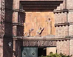 Diagonal vorspringende Anbauten bilden die Treppe, die zum Portal in der Turmfront führt, über dem ein Terrakotta-Relief im Tympanon die Erscheinung des Herrn nach der Auferstehung zeigt. Das Reliefbild und die 1930 angebrachte Inschrift SOLI DEO HONOR (lateinisch ‚Gott allein die Ehre‘) über den rechteckigen Flügeltüren entstanden nach Entwürfen des Bildhauers Paul Halbhuber. An der Fassade finden sich weitere eingesetzte Sternformen, unter anderem auch als Fenster.[1]