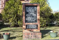 Das seelsorgerische Wirken von Pfarrer Lenzel endete schließlich mit seiner Verhaftung durch die Gestapo am 7. Januar 1942. Vorgeworfen wurde ihm sein Einsatz für die Zwangsarbeiter und sein Eintreten für Jesus Christus mit dem Gebot der Nächstenliebe. Er wurde am 3. Juli 1942 im Konzentrationslager Dachau ermordet. Zu seinem Gedenken brachte die VVN-Organisation am 8. September 1945 neben dem Kircheneingang eine Gedenktafel mit den Lebensdaten des Geistlichen und der Inschrift „als Kämpfer gegen den Faschismus“ an. Anlässlich des 40. Jahrestages der Wiederkehr des Todestages wurde diese Tafel abgehängt und stattdessen ein von der Kirchengemeinde finanziertes und in Auftrag gegebenes Denkmal eingeweiht, wie im Bild zu sehen.[10]