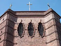Das aus Backsteinen bestehende Kirchengebäude wurde durchgehend mit Beuthener Klinkern verkleidet.[9] Nach den Plänen des Architekten sollte das Gotteshaus durch Pfarr- und Gemeindehaus rechts und links von dem aufragenden querrechteckigen Turm ergänzt werden,[44] jedoch konnte dieser Plan aus Kostengründen nicht umgesetzt werden.