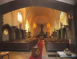 Der Innenraum, der von Osten unter dem Turm durch einen Windfang betreten wird, ist in einer Mischung aus Jugendstil und Expressionismus ausgeführt. Im Wesentlichen ist im 21. Jahrhundert noch alles im Original belassen. Die halbrunde Apsis mit ihren vertikalen nach oben parabolisch zusammenlaufenden Gliederungen baut sich um den Hochaltar auf. Die Wände zeigten anfangs eine grob strukturierte und dunkel wirkende Farbigkeit, die nach 1950 aufgehellt wurden. Die Fenster in der oberen Reihe des Chorraumes sind mit erhalten gebliebenen Original-Glasscheiben aus leicht eingefärbtem opakem Glas in den 1950er Jahren nachgestaltet worden, die übrigen Fensterflächen im Obergaden des Langhauses, als schmale Rundbogenfenster ausgeführt, sind gleichzeitig in angepasster zarter Farbigkeit eingefügt worden. Die früheren dreiteiligen Fenster mit einem Bildnis in der Mitte sind nicht mehr vorhanden und auch nicht nach den Bauunterlagen erneuert worden.