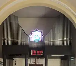 Im Jahr 1934 wurde auf der Westempore das Manual einer Orgel installiert, das aus der Orgelbauwerkstatt Rieger aus Böhmen stammte.[10] Es nahm nun den Platz ein, den der Charlottenburger Orgelbauer Hans Casper mit seinem Werk eigentlich hätte bestücken sollen. Zu diesem Vorgang vermerkte Kuratus Lenzel in der Chronik:[22] „Besonders der Orgelbauer Casper gab vor, bis zur Konsekration die Orgel fertig zu machen und verbarg hinter nächtlichem Tun und Treiben seine Unfähigkeit. Und wirklich, er hat das Werk nicht geschafft.“ Die Gemeinde war allerdings in Vorleistung gegangen und erhielt ihr Geld vom Orgelbauer Casper später nicht mehr zurück. Ein zweites Manual für die Rieger-Orgel wurde zu Pfingsten 1938 eingebaut.[10] Die Beschaffung der Orgel stellte eine „achtjährige Geschichte einer wahren Tragödie“ dar.[23]