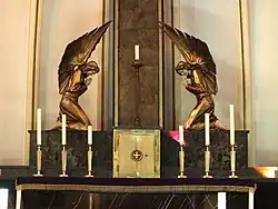 Der Tisch des Herren ist ein Werk des Pankower Bildhauers Paul Müller.[49][50] Das Tabernakel und die Cherubims entstanden in der Werkstatt des Bildhauers Hans Lotter aus Berlin-Frohnau.[51] Die Skulpturen der Seitenaltäre mit der sitzenden Gottesmutter und die Josephfigur stammen ebenfalls aus der Werkstatt von Lotter. Als Vorbild für die Marienfigur diente ihm eine von Guido Martini geschnitzte Holzfigur aus dem Besitz von Pfarrer Lenzel.[21] Für den Josephsaltar schaffte die Gemeinde 1940 noch einen gesonderten Altarstein an.[52]