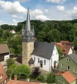 Der eingezogene, dreiseitig geschlossene Chor im Osten entstand 1439. Die drei unteren Geschosse des Chorflankenturms aus Quadermauerwerk an seiner Nordwand wurden 1461 errichtet. Er wurde später mit einem schiefergedeckten Geschoss aufgestockt, das die Turmuhr und den Glockenstuhl beherbergt, und zwischen Scharwachttürmen an den vier Ecken mit einem achtseitigen Knickhelm bedeckt. Das verputzte Langhaus der Saalkirche ist mit einem Satteldach bedeckt, das dendrochronologisch auf 1527–34 datiert wurde.