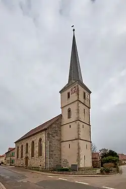 Die unteren Geschosse des Kirchturms aus verputzten Bruchsteinmauerwerk mit Ecksteinen im Westen des Langhauses der Saalkirche stammen von 1495. Er wurde 1756 aufgestockt, um die Turmuhr und den Glockenstuhl unterzubringen, und mit einem achtseitigen, schiefergedeckten Knickhelm bedeckt. Das unverputzte Langhaus aus Muschelkalk wurde zwischen 1851 und 1855 nach Osten angebaut und mit einem Satteldach bedeckt. Aus dieser Zeit stammt die Kirchenausstattung.