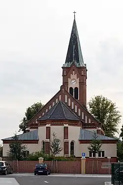 Die Bauarbeiten für die Saalkirche begannen am 28. August 1905, die Grundsteinlegung folgte am 17. September 1905, und die Weihe fand am 19. August 1906 durch Carl Kleineidam statt. Sie besteht aus einem rechteckigen Langhaus, dessen gestufte Strebepfeiler die vier Joche markieren, die innen mit einem Stichkappengewölbe überspannt sind, einem eingezogenen, dreiseitig geschlossenen Chor im Osten und einem dreigeschossigen Kirchturm auf quadratischem Grundriss im Westen. Den Chor flankieren im Norden und im Süden quadratische Anbauten für die Sakristei und die Winterkirche. Der Anbau im Südwesten des Kirchturms enthält eine Treppe, die zur Empore im hinteren Teil des Kirchenraums führt. Bei der Sanierung 1967–71 wurden der Kirchturm und das Langhaus neu gedeckt.