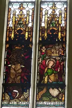 An der Südwand des Langhauses hat sich das einzige gotische Glasgemälde der Würzburger Schule erhalten.[7] Es entstand wahrscheinlich in der Zeit des Kirchenneubaus im 15. Jahrhundert. Dargestellt wurde Maria mit der Sonne umkleidet. Ihr wurde der Mond zu Füßen gelegt, während die Sterne ihr Haar bekränzen. Besondere Bedeutung für die Baugeschichte der Kirche selbst hat ein Engel, der das Wappen der Stadt Gerolzhofen in den Händen trägt. Darüber trägt ein Mann Steine zu der im Bau befindlichen Kirche, während ein anderer Mörtel anrührt. Beide Fensterscheiben schließen mit gotischen Fialen ab.
