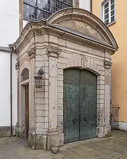 Daher konnte man vom ebenerdigen Gang durch mehrere Türen sowohl die Kirche, aber auch das Kloster betreten. Von einem oberen Gang, also nicht vom Kirchenraum aus, betrat man die Kanzel. Über eine Treppe gelangte man auch zu zwei an der Epistelseite (rechts) des Hochaltars übereinander gelegenen Logen, die dem Erzbischof und seinem Gefolge vorbehalten waren. Eine hinter dem Hochaltar befindliche Tür führte durch einen Gang ins Schloss des Fürstbischofs.