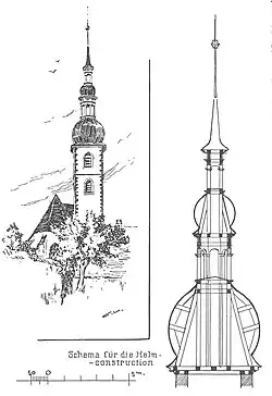 Innen hat die Kirche eine Flachdecke. Lediglich der Chor besitzt ein Kreuzrippengewölbe. Der Turm hat eine Höhe von 47 Metern und fünf Geschosse. Die unteren Geschosse sind nur mit Schießscharten versehen, das vierte Geschoss hat Spitzbogenfenster mit Schallarkaden. Im obersten Geschoss, das durch ein Gesims auch nach außen hin kenntlich ist, sind Rundbogenfenster angebracht. Eine welsche Haube mit doppelter Laterne schließt den Turm nach oben ab.[4]