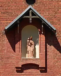 Das Eingangsportal befindet sich auf der Ostseite, über ihm zeigt eine Statue Maria mit dem Jesuskind. Das Kirchenschiff wird im Inneren von einer flachen Decke überspannt. Die Fenster des Schiffs sind als große Rundbogenfenster ausgeführt. Die nach innen halbrund ausgeführten Fenster der Apsis sind jetzt vermauert.