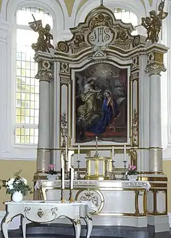 Ein Hochaltar nimmt den größten Teil des Chorraumes ein. Das Altarbild, ein großes Ölgemälde mit der Darstellung der Verkündigung Mariens, ist von der Kommerzienrätin von Friedländer-Fuld aus dem Schloss Lanke gestiftet worden.[1] Der davor aufgestellte Altartisch wurde von dem Bildhauer Friedrich Schötschel angefertigt. Von ihm stammen auch das Vortragekreuz und das Schmuckblatt am Haupt-Kirchenportal. In der Hallenkirche sind weitere barocke Heiligenstatuen zu sehen. Ein aus Sandstein gearbeitetes Taufbecken steht in einer Nische links neben der Altarapsis. Eine Kanzel vervollständigt die Ausstattung. Bemerkenswert ist die mit Fresken ausgemalte Kuppel, die sich über die gesamte Kirchenbreite erstreckt.