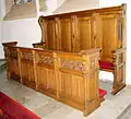 - Die Kanzel aus der ersten Hälfte des 17. Jahrhunderts befindet sich an der fensterlosen Nordwand. Auf dem Schalldeckel befindet sich eine Figur, die einen Zisterzienser (möglicherweise den Heiligen Bernhard von Clairvaux) darstellt.[5]