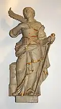 - Im Chorraum befinden sich sechs hölzerne Heiligenfiguren, deren Entstehungszeit auf ca. 1700 geschätzt wird. Sie stellen Maria Magdalena (mit Totenschädel), die Heilige Barbara (Turm), den Heiligen Wigbert (Traube und Weinfass), Robert von Molesme (Mitbegründer der Zisterzienser, mit Kirche), Katharina von Siena (Palmzweig und Kreuz) sowie die Gertrud von Helfta (mit glühendem Herzen und Kreuz) dar.[6]