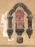 Detail von Nordost mit schwarz glasiertem Kleeblattfries und Sonnenrelief