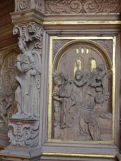 Die Kanzel wurde von Claus Heims geschnitzt. Er soll sich selber in einem Bildfeld porträtiert haben. 1641 wurde das Werk von den Nachkommen Ketel Wolbersens gestiftet. Von rechts nach links werden gezeigt: Christus vor Kajaphas, seine Geißelung, Kreuztragung und Kreuzigung. Die Personifikationen zwischen den Reliefs stehen für die christlichen Tugenden Hoffnung, Liebe und Glaube. Im Jahr 2001 wurde die Kanzel restauriert.