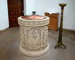 Mehrere bedeutende Ausstattungsstücke wurden aus der alten Kirche übernommen. Neben der etwa 1260/70 geschaffenen, als Gnadenbild verehrten und gekrönten Eichenholzskulptur der thronenden Gottesmutter mit dem Kind[16] sind besonders der etwa gleichzeitig entstandene figürliche Taufstein und das Triumphkreuz aus dem 14. Jahrhundert bemerkenswert. Die neugotische Kanzel von 1855 mit den Figuren Christi und der vier Evangelisten wurde 2003 zu einem Altar umgestaltet. In der Marienkapelle sind historische Votivgaben ausgestellt.