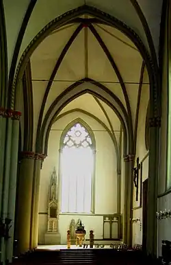 Die fünf Chorfenster sind in ein dichtes System von Rund-Diensten eingespannt. Je drei dieser gebündelten Dienste stehen in den Ecken, der mittlere nimmt die Rippe auf, die beiden seitlichen die Schildgurte über den Fenstern. Das fünfkappige Rippengewölbe hat seinen Schlussstein genau im Scheitel des Chorbogens.