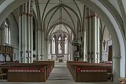 Die rekonstruierte steinerne Westempore eröffnet ihr Kreuzrippengewölbe zum Mittelschiff hin in einem mächtigen Segmentbogen, an den Schmalseiten in Spitzbögen. Darüber trennt eine geschlossene Mauer den Emporenraum von den Seitenschiffen.