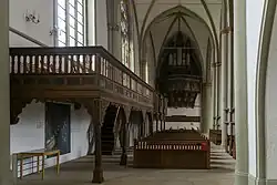An der Westwand befinden sich seit 1966 die Reste der Brüstung eines vermutlichen Bürgermeisterstuhls von 1692. Dieser befand sich bis 1964 auf einem Podest unterhalb der Schwalbennestorgel an der Ostwand. Eine kleine Treppe mit vier Stufen und Holzgeländer führte zu diesem Podest, das von einer Brüstung mit acht mal drei Holzfeldern, getrennt durch gedrehte Säulen, umgeben war. Nach dem Abbau wurden die nicht bemalten Felder entfernt, die verbleibende Brüstung ist nun noch etwa vier Meter lang und 1,33 Meter hoch. Die Wappen und Inschriften sind im Jahr 1912 restauriert worden. Das erste Feld zeigt das Wappen von Tilhen Von Leese und die Initialen G.I.T.V.L. (Gottschalck Iohan Tilhen Von Leese). Im zweiten Feld ist das Spiegelmonogramm Von Leeses mit der Jahresbezeichnung Anno 1692 zu sehen. Im dritten Feld wiederum das Wappen, allerdings gespiegelt zum ersten Feld, dazu die Initialen T.L.T.F.V.L. In den Folgefeldern die Wappen und Namen der Herren V(on) D(er) Wipper, Grote und Derendal. In den ersten drei Sockelfeldern befindet sich die lateinische Inschrift PRÆSTANT ÆTERNA CADUCIS (deutsch Ewiges geht über Vergängliches[3]).[4]