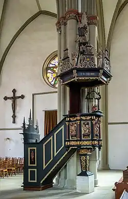 Die Kanzel wurde in den Jahren 1643/44 vom Lemgoer Meister Hermann Voß aus Lindenholz geschnitzt und von Berent Lalleken und Jobst Tappe 1646 farbig gefasst. Am Korb die vier Evangelisten und Christus als Schmerzensmann. Auf dem Schalldeckel fünf Engel mit Marterwerkzeugen, in der Mitte Moses mit den Gesetzestafeln.
