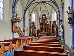 Der einschiffige barocke Saalbau ist fünfachsig und mit einem 5/8-Chorabschluss angelegt. Das ganz in Weiß gehaltene Gotteshaus zeichnet sich durch gotisierende Formen aus:[5] außen der Kranz von Strebepfeilern, innen das Gewölbe mit Kreuzrippen und Schlusssteinen, dessen Gurtbögen von gekröpften Pilastern gestützt werden. Große rundbogige Fenster lassen ausreichend Licht in den Innenraum.