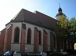 Der etwa 30 Meter hohe spätgotische Turm mit seiner achtseitigen Turmkrone ist das Wahrzeichen der Stadt. Sein oberer Teil wurde 1987 bis 1989 abgerissen und wieder aufgebaut. In den Jahren 1990 bis 1997 sowie 2013 fanden weitere Instandsetzungsmaßnahmen innen und außen statt.