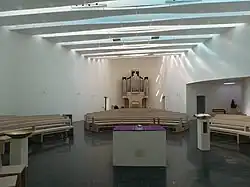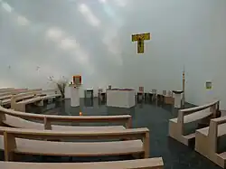Der helle Innenraum ist vom Kontrast der weißen geschwungenen Wände zum dunklen Steinfußboden mit Spuren fossiler Meerestiere geprägt. Die sandfarbenen Bänke sind im Halbkreis auf den Altar hingeordnet. Die dreieckig an den Hauptraum angefügte Marienkapelle, in deren Spitze das Marienbild steht, lädt zur Einzelandacht ein.