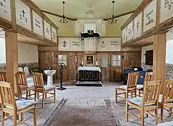 Im Kirchenschiff befindet sich eine rund umlaufende Empore. Auf den Brüstungsfeldern befinden sich abwechselnd biblische Symbole und Sprüche, geschaffen von einem örtlichen Maler aus dem Jahr 1949. Der kleine Kanzelaltar der Barockzeit ist in diese einbezogen. Der Ort, an dem der Prediger steht, ist von einem lebendigen Rahmenwerk des Barock umgeben.[1] Die Orgel von Friedrich Wilhelm Dornheim (Eichfeld) aus dem Jahr 1863 ist bereits seit den 1950/60er Jahren nicht mehr spielbar.[2] Im Turm hängen zwei Glocken, eine davon aus dem Jahr 1780.