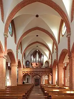 Die Kirche wurde aus Backstein gebaut und verfügt neben dem Hauptschiff über zwei Seitenschiffe und fünf Joche. Über den Seitenschiffen befinden sich Strebebögen. Der Chor ist polygonal mit Seitenanbauten gestaltet. Der Obergaden des Hauptschiffes ist mit runden Fenstern versehen, welche von einer breiten Spitzbogenblende gefasst werden.