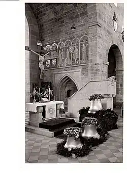 Veränderungen, die vor allem in der Barockzeit stattgefunden hatten, wurden auch nach dem Zweiten Weltkrieg rückgängig gemacht. Dabei wurde der ursprüngliche Zustand großenteils wiederhergestellt.[19] Auf der Steinkanzel der ehemaligen Klosterkirche ist ein Reichsadler aus Stein abgebildet, der über den Abbildungen der Evangelisten auf einer (Welt-)Kugel steht. Heute wird er durch ein Antependium verdeckt. Der Entwurf für diese Kanzel stammt aus dem Jahr 1942, dessen Umsetzung erfolgte 1946.
